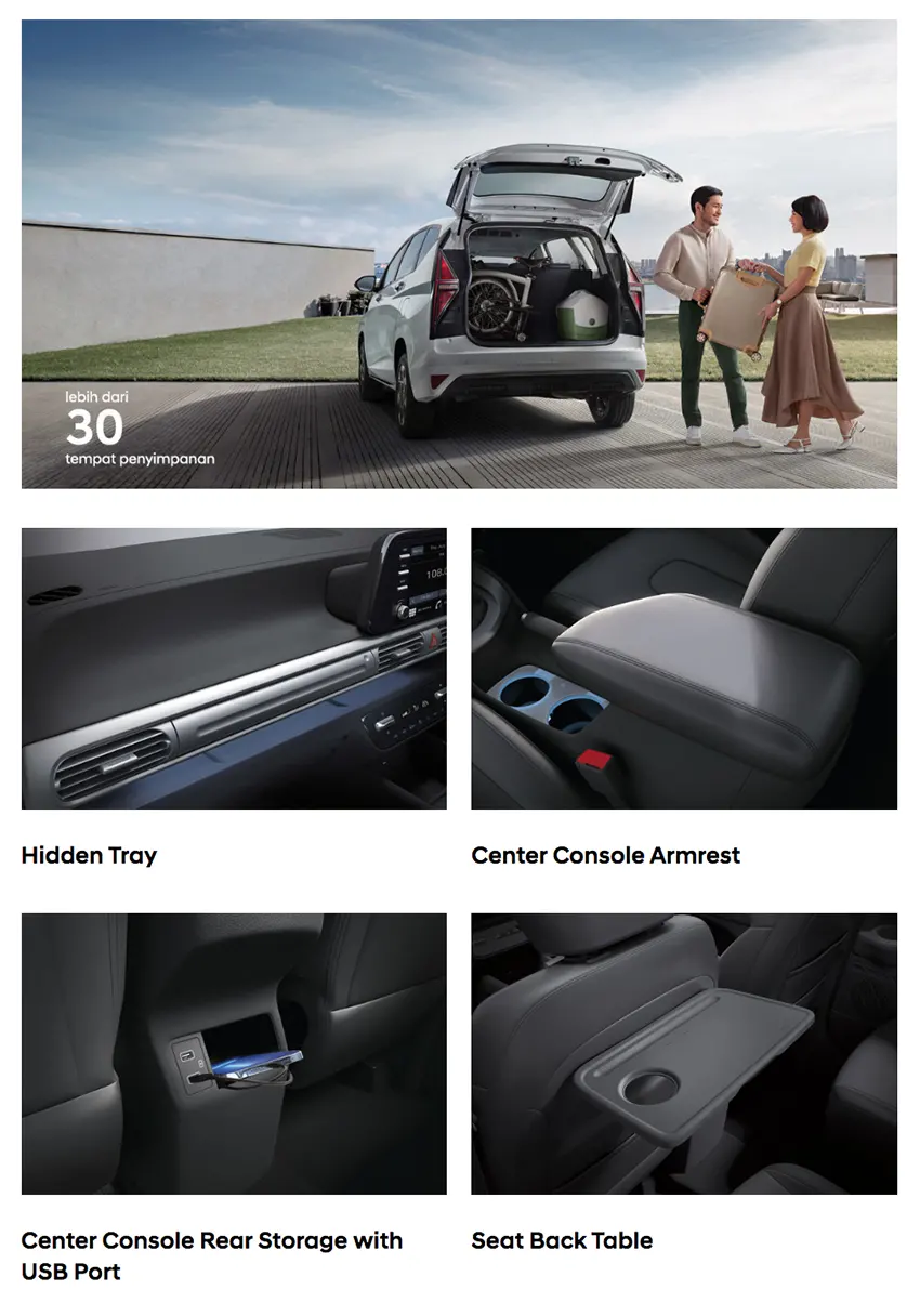 Terdapat lebih dari 30 tempat penyimpanan yang didesain secara ergonomis dan terletak di setiap sisi New STARGAZER. Mulai dari bagian depan, tengah, samping, hingga belakang, memberikan kepraktisan untuk Anda dan keluarga dalam menyimpan lebih banyak barang di perjalanan.