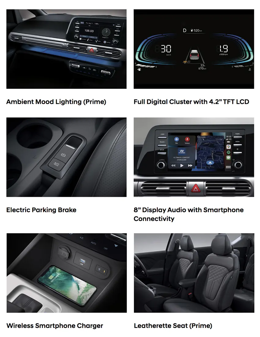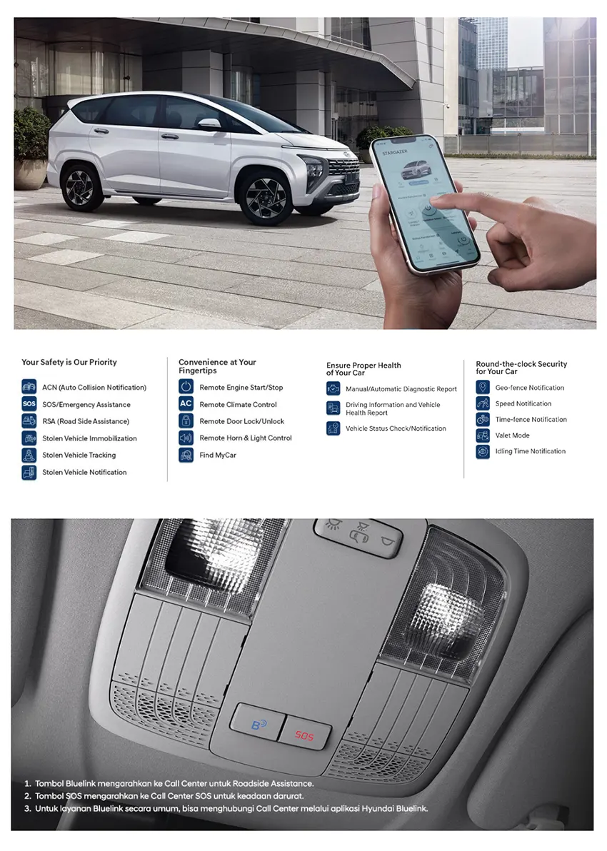 New STARGAZER telah dilengkapi dengan teknologi konektivitas Hyundai Bluelink, sebuah platform yang memudahkan pengecekan informasi penting tentang mobil Anda. Terhubung dengan call center Hyundai 7 x 24 jam saat terjadi kondisi darurat untuk segera memberikan Anda bantuan.