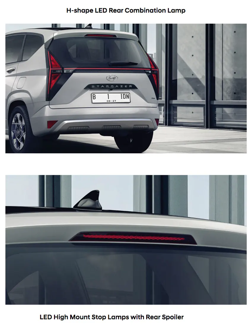 Desain futuristik dan dinamis akan langsung terlihat melalui one curve design yang diciptakan untuk memalingkan setiap pandangan. Dilengkapi dengan Horizon type DRL (Daytime Running Lights) dan H-shape LED Rear Combination Lamp, New STARGAZER semakin menawan dengan eksterior yang membuat Anda dan keluarga tampil memukau bagai bintang.