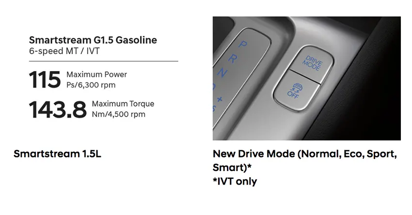New STARGAZER dilengkapi mesin Smartstream 1.5L dengan sistem Intelligent Variable Transmission (IVT) hasilkan performa tangguh, responsif, serta efisien. Fitur Drive Mode juga tersedia untuk pilihan gaya berkendara yang paling sesuai untuk Anda